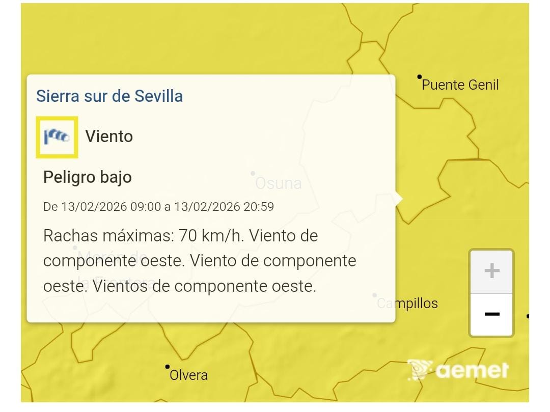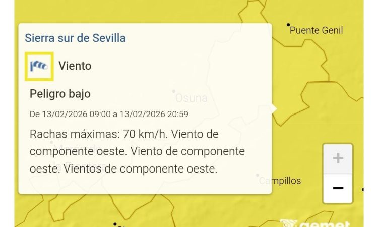 Desde el Ayuntamiento de Casariche informamos que la Agencia Estatal de Meteorología (AEMET) ha activado aviso amarillo por viento en la zona Sierra Sur de Sevilla, previsto para mañana viernes, 13 de febrero de 2026. Concretamente, el aviso estará activo desde las 09:00 hasta las 20:59 horas con rachas de viento máximas de hasta 70 km/h