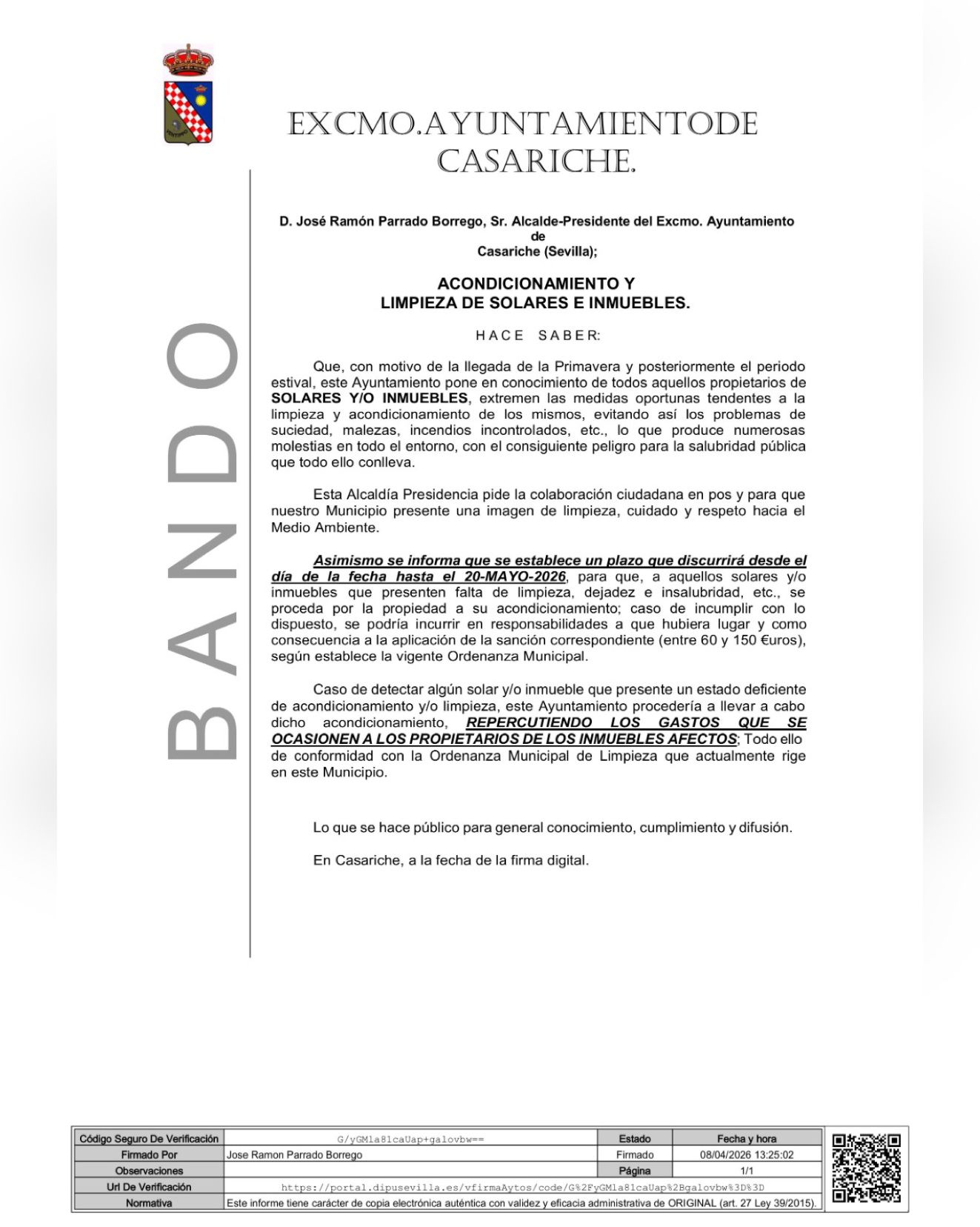 En base a lo anterior, se establece un plazo que comprenderá desde la fecha de publicación del presente bando hasta el próximo 20 de mayo de 2026, para que aquellos solares y/o inmuebles que presenten deficiencias de limpieza, abandono o insalubridad sean acondicionados por sus propietarios.