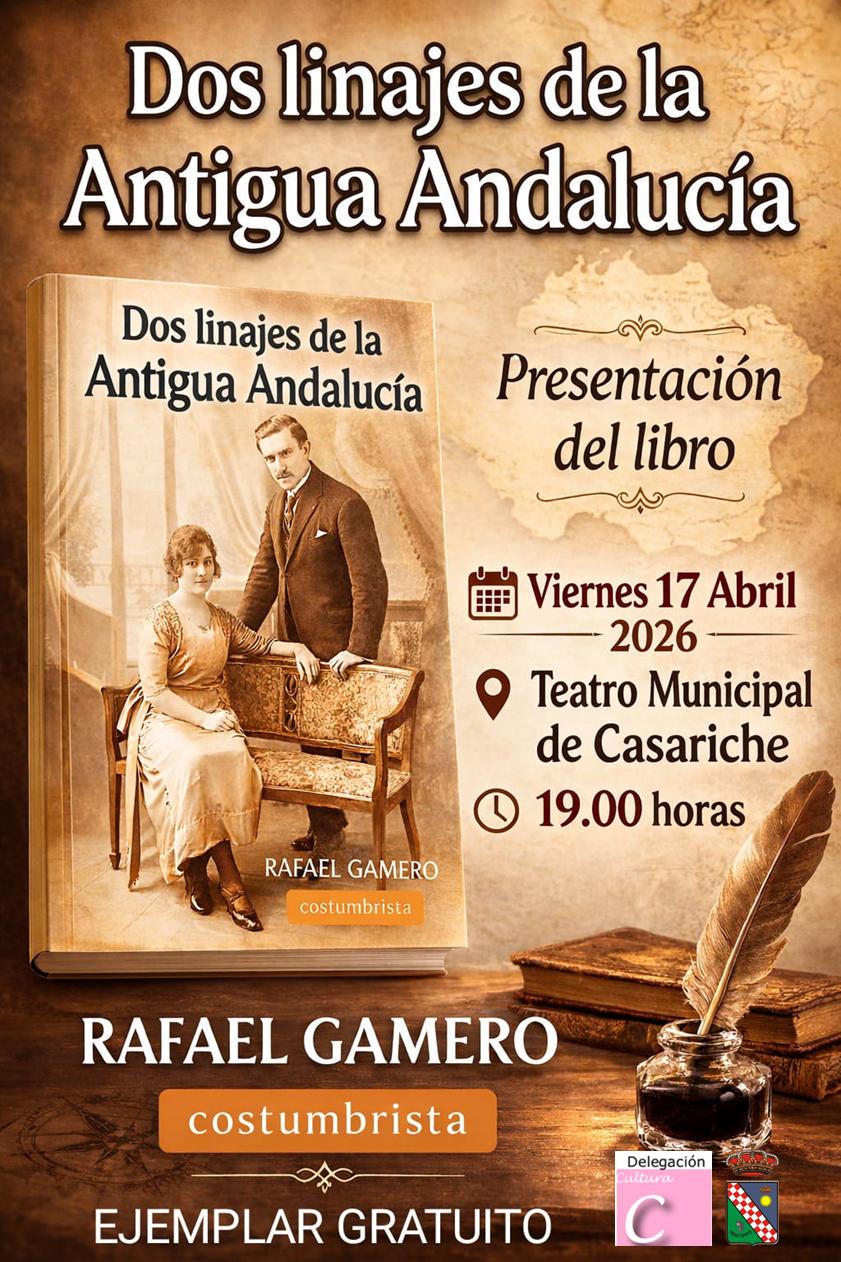 La Delegación de Cultura del Ayuntamiento de Casariche invita a todos nuestros vecinos y vecinas a asistir a la presentación del libro “Dos linajes de la Antigua Andalucía”, obra del autor Rafael Gamero, reconocido por su carácter costumbrista.