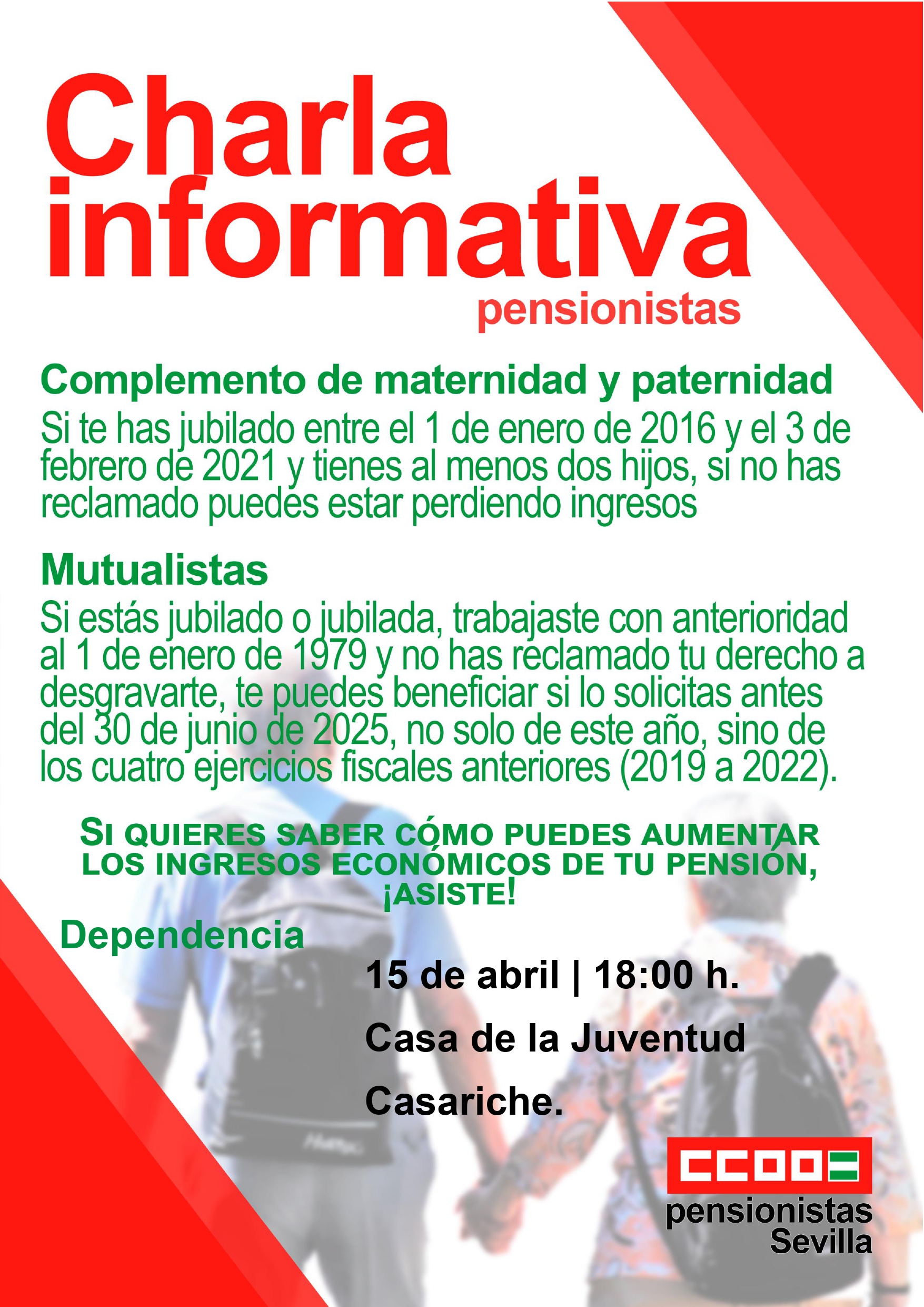 El Ayuntamiento de Casariche informa de la celebración de una charla informativa dirigida a personas pensionistas, organizada por CCOO Pensionistas Sevilla, en la que se abordarán distintas medidas y recursos destinados a la mejora de sus ingresos económicos.