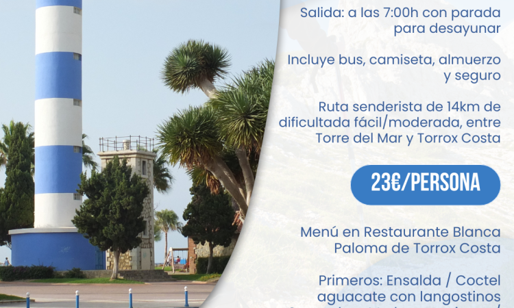 Esta actividad, con plazas limitadas, se celebrará el viernes 15 de mayo y consistirá en un recorrido de aproximadamente 14 kilómetros, de dificultad fácil a moderada, entre las localidades de Torre del Mar y Torrox Costa.