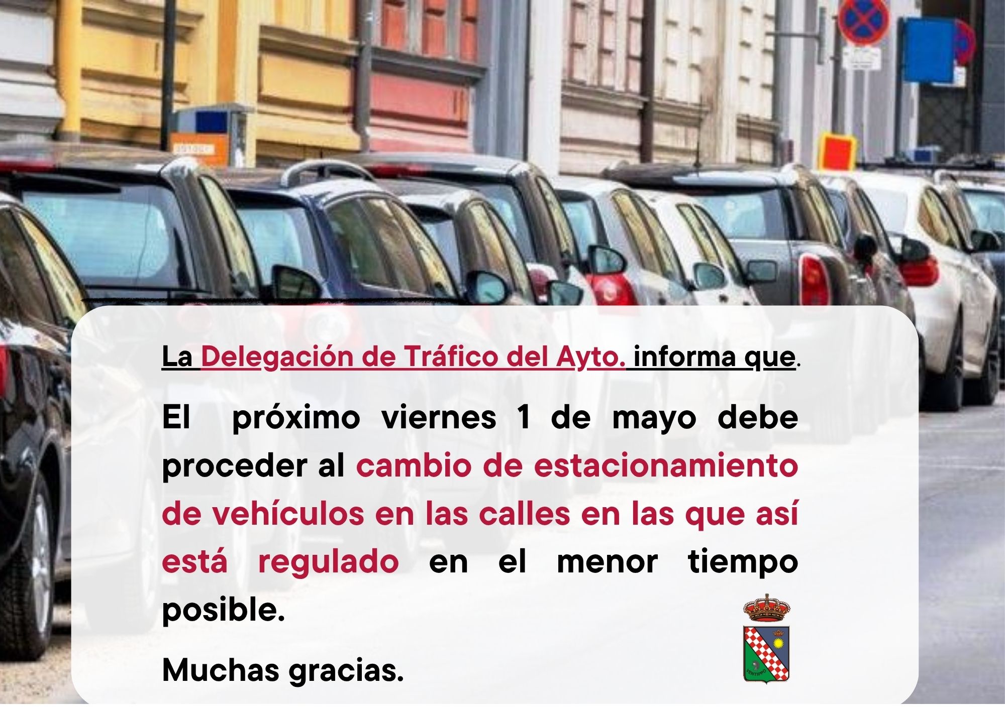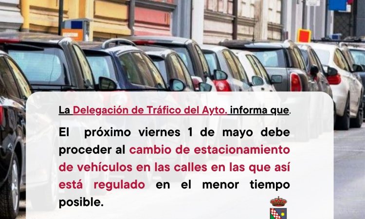 La Delegación de Tráfico del Ayuntamiento recuerda a todos los vecinos y vecinas del municipio que este viernes 1 de mayo se realizará el cambio de estacionamiento en las calles en las que así está regulado y, que por lo tanto, deberán cambiar sus vehículos lo más pronto posible.