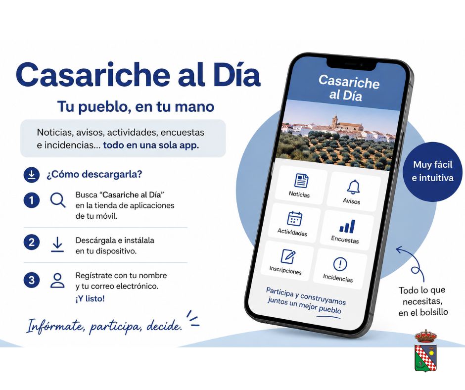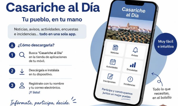 Si aún no la tienes, puedes descargarla fácilmente buscando “Casariche al Día” en la tienda de aplicaciones de tu móvil. Una vez instalada, solo tienes que registrarte con tu nombre y tu correo electrónico, y ya podrás empezar a utilizarla.