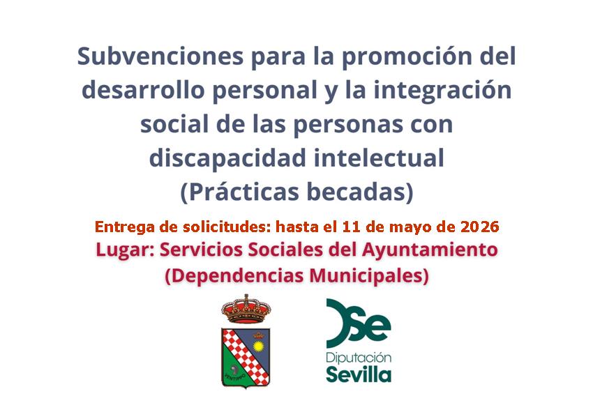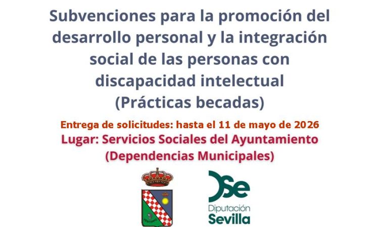 Informamos que hasta el 11 de mayo estará abierto el plazo de presentación de solicitudes para las subvenciones destinadas a la promoción del desarrollo personal y la integración social de las personas con discapacidad intelectual en entidades locales (prácticas becadas), concedidas por la Excma. Diputación Provincial de Sevilla para favorecer la inserción sociolaboral de personas con discapacidad intelectual facilitándoles experiencia pre-laboral en entornos de trabajo normalizados, con el fin de que puedan ayudar a su inclusión posterior en el mercado de trabajo. Se trata de prestaciones económicas en concepto de becas, no teniendo contrato laboral ni alta en Seguridad Social.