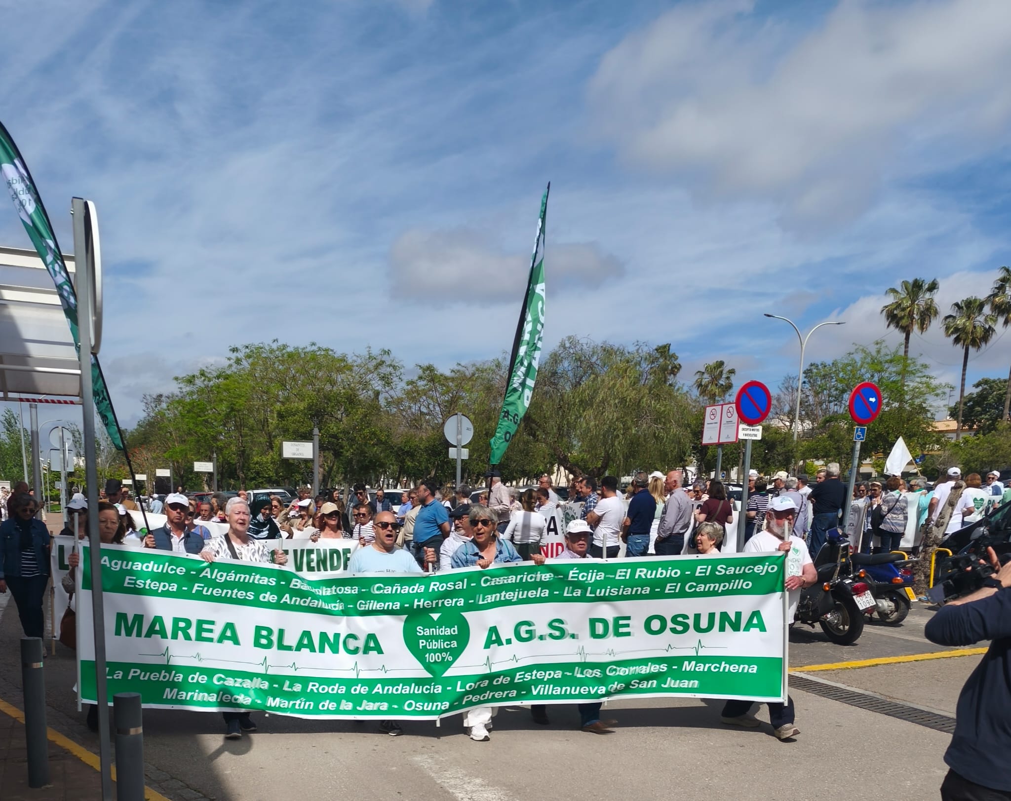 La movilización, que ha comenzado a las 11:00 horas bajo el lema “Sanidad Pública 100%”, ha congregado a numerosas personas llegadas tanto de Osuna como de otros municipios de la comarca integrados en esta Área de Gestión Sanitaria.