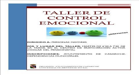 ¿Quieres aprender a controlar tus emociones?. El Ayuntamiento de Casariche, a tavés de su Concejalía de Bienestar Social, ha organizado un Taller de Control Emocional dirigido a personas mayores, que se va a impartir en el Centro de Participación Activa de Casariche (Hogar del Pensionista), los martes de 6’30 a 7’30 h. de la tarde. Tendrá como monitora a Lola Borrego (Psicóloga) y es de carácter gratuito.