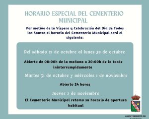 Informamos a todos los vecinos y vecinas de la localidad que con motivo de la Víspera y Celebración del Día de Todos los Santos se