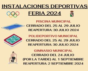 Leer másEl Ayuntamiento informa que la Piscina Municipal, el Polideportivo y el Gimnasio Municipal van a cerrar sus puertas durante la semana de Feria. En este