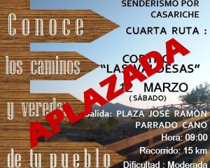 La Delegación de Juventud de nuestro Ayuntamiento informa que la ruta al ‘Cortijo de las Valdesas’, prevista para mañana sábado 12 de Marzo, ha sido