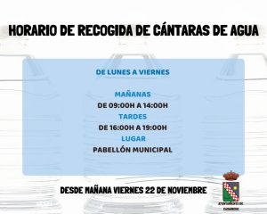 Informamos que mañana viernes, 22 de noviembre comienza la recogida de cántaras de agua que se ha puesto a disposición de todos los vecinos y