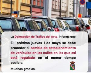 La Delegación de Tráfico del Ayuntamiento recuerda a todos los vecinos y vecinas del municipio que mañana jueves 1 de mayo se realizará el cambio