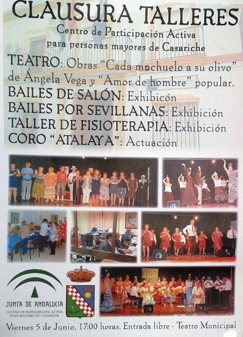 El Centro de Participación Activa para personas mayores de Casariche, conocido comúnmente por Hogar del Pensionista, celebra en la tarde de hoy viernes 5 de Junio el acto de clausura de los talleres que se han estado desarrollando en el centro durante todo el presente escolar 2014-2015.