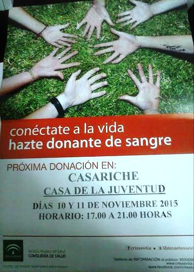 Los días 10 y 11 de Noviembre habrá una nueva campaña de donación de sangre en CASARICHE. Será en LA CASA DE LA JUVENTUD, en horario de 17.00 a 21.00 horas.
