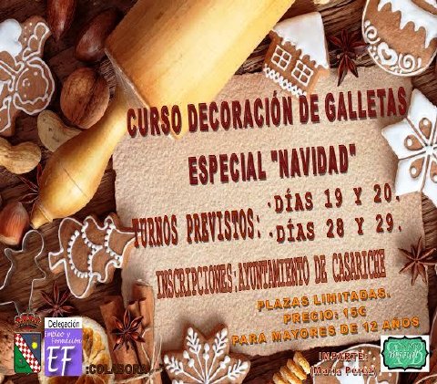 Desde el Ayuntamiento de Casariche, a través de su Delegación de Empleo y Formación, te proponemos participar en un Curso de Decoración de Galletas especial «Navidad». En principio, hemos previsto dos turnos: uno se celebrará los días 19 y 20 de Diciembre, y el otro, los días 28 y 29. Las plazas son limitadas y el precio de inscripción es de 15 Euros/persona.