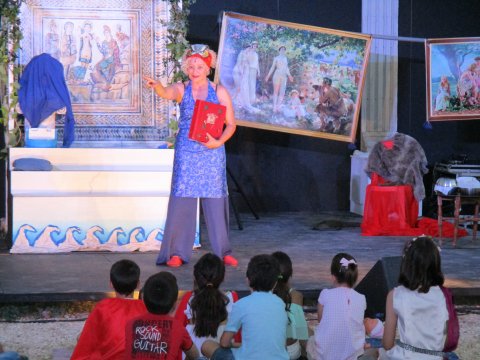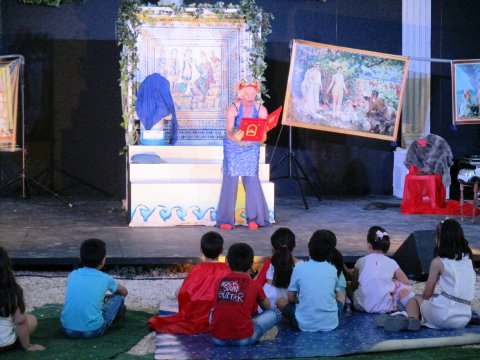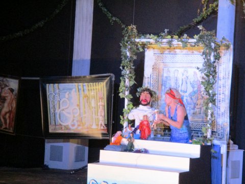 El Teatro Romano acogió dos espectáculos de matrícula. Pasadas las nueve y media, la Compañía Escenoteca Servicios Culturales, acercó las artes escénicas a los más pequeños con su obra LA MANZANA DE LA DISCORDIA, un teatro infantil de títeres, que abordó el mito representado en nuestra joya patrimonial por excelencia, El Juicio de Paris, mosaico hallado en Casariche en el año 1.985. Con un lenguaje muy cercano y una dinámica muy participativa, los títeres cobraron vida y se salieron del cuadro para interactuar con el público.