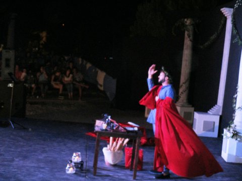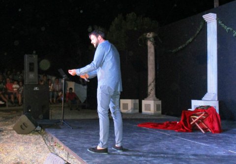 Otro de los platos fuertes de la noche fue, a partir de las 23:30 aproximadamente, la puesta en escena de ARS AMANDI, de Ovidio, a cargo de INDUOTEATRO PRODUCCIONES protagonizada por Chico García (Severo Santacruz en la popular serie de televisión El Secreto de Puente Viejo). Esta obra enganchó de principio a fin al numerosísimo público que se congregó en un Teatro Romano lleno hasta la bandera. Con muchas dosis de humor y sirviéndose únicamente de su palabra y su buen hacer en el escenario, Chico Garcia, en forma de divertida conferencia, fue desvelando el misterio del amor. El montaje recupera el clásico y le da un formato y un contenido del siglo XXI. De hecho, en esta obra hay espacio para la noticia del día y temas de actualidad (políticos, monarcas, empresarios, leyes, etc., tienen también presencia en ella).