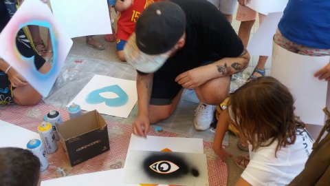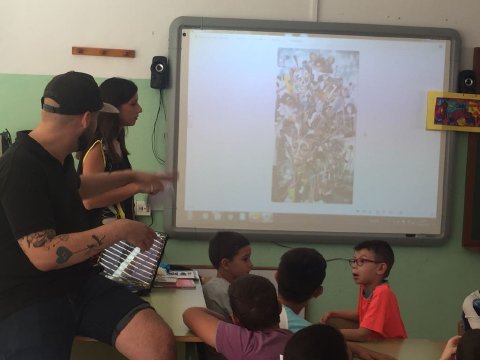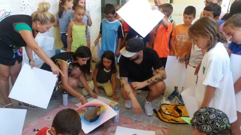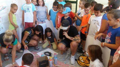 Nuestro artista y vecino Daniel López Pozo, Dalopo, está hoy visitando al alumnado de los Talleres de Verano y el Campamento Urbano. Durante toda la mañana y por grupos, está mostrándoles cómo trabaja, contagiándoles su amor por esta bella profesión, y como no, dejándoles pequeñas muestras de sus magníficos dibujos, a modo de ejemplo.