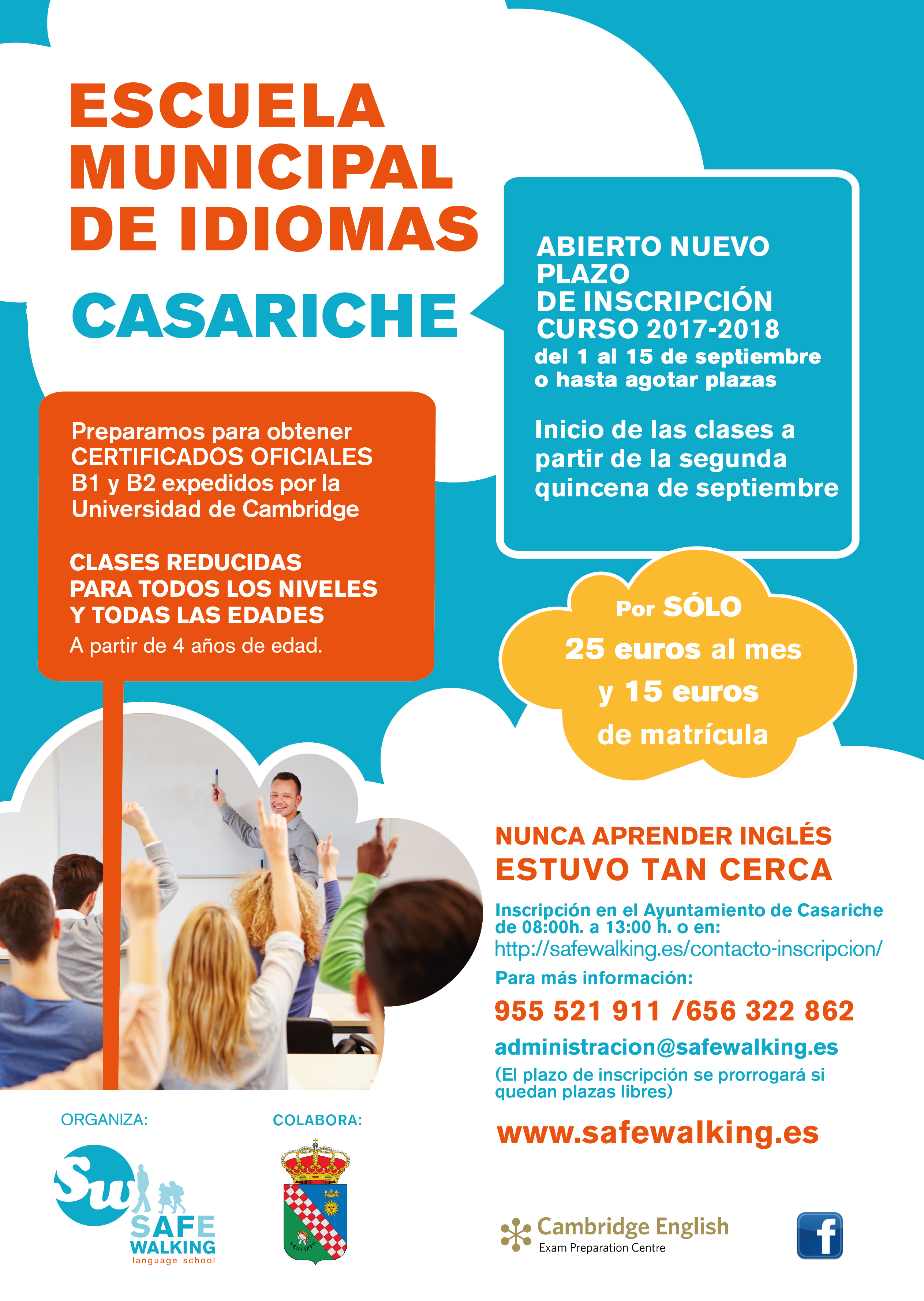 Desde el 1 hasta el 15 de Septiembre o hasta agotar plazas, está abierto el plazo de inscripción para el curso 2017-2018 de la Escuela Municipal de Idiomas en Casariche. El inicio del curso será a partir de la segunda quincena de Septiembre y habrá clases para todos lo niveles y todas las edades (a partir de 4 años), además de preparación para obtener certificados oficiales de B1 y B2 de Cambridge.