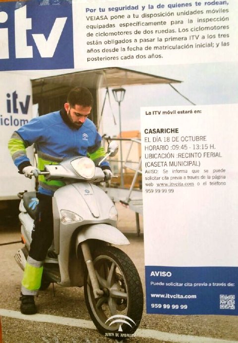 La ITV móvil de ciclomotores se encontrará en Casariche (Recinto Ferial – Caseta Municipal) el día 18 de Octubre de 09:45 a 13:15 horas. Teléfono de información: 959 99 99 99.