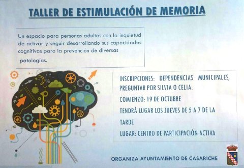 El Ayuntamiento de Casariche ha abierto el plazo de inscripción en un Taller de Estimulación de Memoria, de carácter gratuito, con el fin de que las personas adultas de nuestro municipio dispongan de un espacio donde activar y seguir desarrollando sus capacidades cognitivas, orientado a la prevención de diversas patologías.