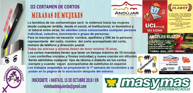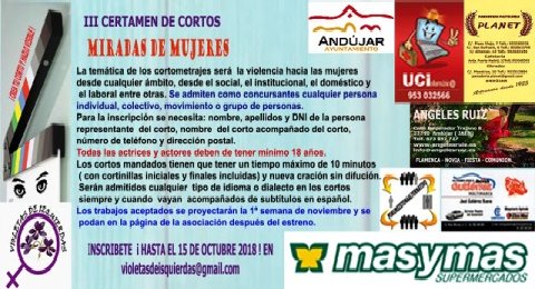 El Ayuntamiento de Casariche informa que está en marcha el Tercer Certamen de Cortos «Miradas de Mujeres», lanzado a los medios de comunicación y redes sociales por la Asociación «Violetas de Izquierdas» y dirigido a persona individual, colectivo, movimiento o grupo de personas que estén interesadas en participar.