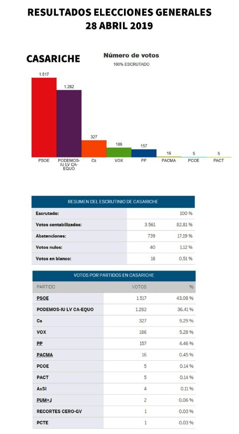 Nuestro municipio acogió ayer 28 de Abril una jornada electoral perfectamente organizada y sin incidencias, que ha registrado una participación altísima, del 82,81%, y dio la victoria en las Elecciones Generales, con un total de 3.561 votos contabilizados, al Partido Socialista, que obtuvo 1.517 votos (43,08%).