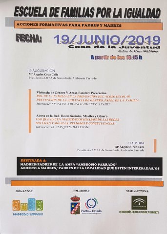 El Ampa Ambrosio Parrado, en colaboración con el Pacto de Estado Casariche y subvencionada por la Consejería de Educación y Deporte, ha organizado una Escuela de Familias por la Igualdad, que se celebrará el miércoles 19 de Junio en el Salón de Usos Múltiples de la Casa de la Juventud, a partir de las 18:15 horas.