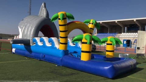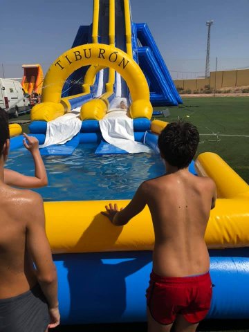 El campo de césped artificial de nuestro Complejo Deportivo Sergio Carnerero Gil acogió una divertida y refrescante fiesta acuática, con fiesta de la espuma, concentración de hinchables y tobogán gigante.