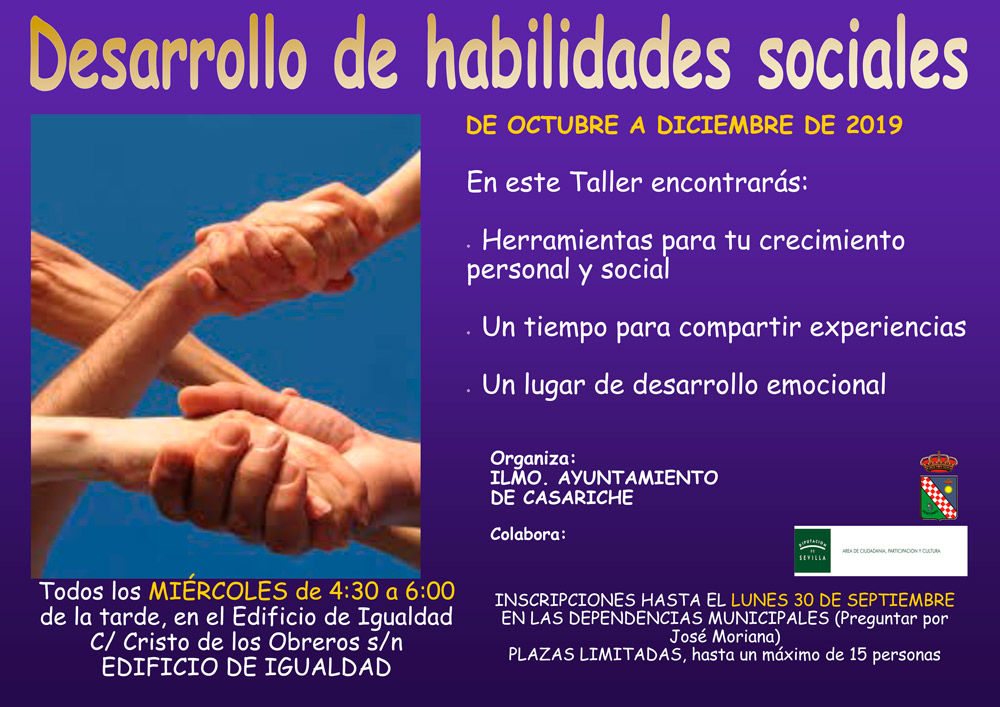 Un año más, se pone en marcha una nueva edición del Taller “Desarrollo de Habilidades Sociales”, que se impartirá entre los meses de Octubre a Diciembre todos los miércoels en horario 16:30 a 18:00 horas en el Edificio de la Igualdad, junto al Pabellón Municipal en calle Cristo de los Obreros.