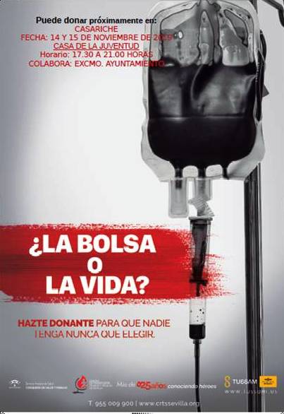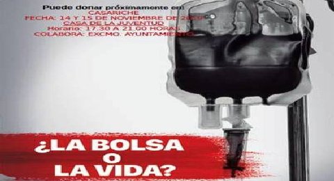 El jueves 14 y el viernes 15 de Noviembre hay una campaña de donación de sangre en nuestro municipio, que será la última de este año. Como viene siendo habitual, será en la Casa de la Juventud, en horario de 17:30 a 21:00 horas.