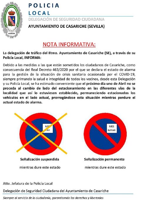 El Ayuntamiento de Casariche, desde su Delegación de Tráfico informa que ebido a las medidas a las que están sometidos los ciudadanos de Casariche, como consecuencia del decreto 463/2020, por el que se declara el estado de alarma para la gestión de la situación de crisis sanitaria ocasionada por el COVID-19, siempre primando la salud e integridad de todos los vecinos, se ha estimado conveniente que, a partir del próximo día 1 de Abril, NO se proceda al cambio de lado de estacionamiento en las diferentes vías de la localidad que así lo tuvieran establecido, permaneciendo estacionados los vehículos en el lado actual, prorrogándose esta situación mientras perdure el actual estado.