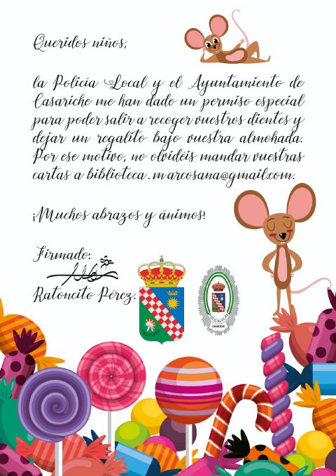 La Policía Local de Casariche y nuestro Ayuntamiento informan que han otorgado un permiso al Ratoncito Pérez que le permite visitar a los niños del pueblo a los que se les caigan los dientes durante el confinamiento por el coronavirus, así como dejarles un regalito debajo de la almohada.