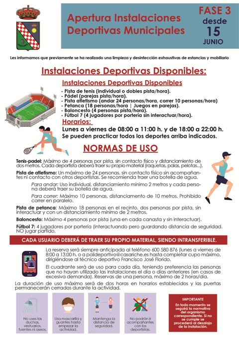 Continuando con el avance progresivo hacia la nueva normalidad dentro de la desescalada, ya estamos en la fase 3, a partir del lunes 15 de Junio, estarán disponibles las siguientes Instalaciones Deportivas Municipales: