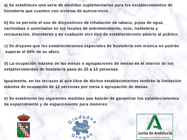 Desde el Ayuntamiento de Casariche, a través de Casariche ante Las Drogas, se da difusión a las últimas medidas tomadas con respecto a la prohibición de uso y consumo de Cachimbas o pipas de agua en establecimientos públicos de ocio nocturno y hostelería, así como a las nuevas medidas preventivas que deben llevar a cabo los establecimientos de restauración y pubs.