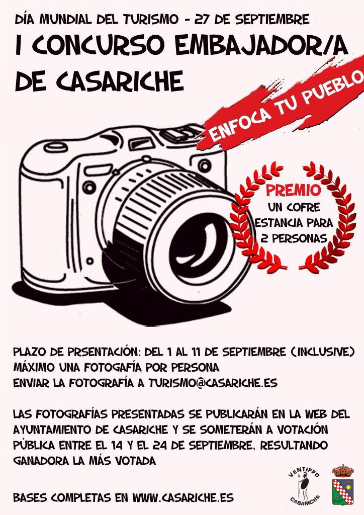 Se pone en marcha el «I Concurso Embajador/a de Casariche» con motivo del día mundial del turismo, que se conmemora el 27 de septiembre. La principal finalidad de esta iniciativa de la Concejalía de Turismo del Excmo. Ayuntamiento, es dar visibilidad exterior a la localidad y difundirla a través de distintos medios empleando fotografías.