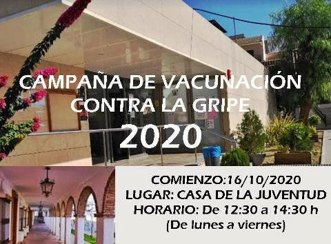 Por ello, la vacunación contra la gripe, que dará comienzo el viernes 16 de Octubre de 2020, se realizará en la Casa de la Juventud, en horario 12:30 h a 14:30 h, de lunes a viernes.