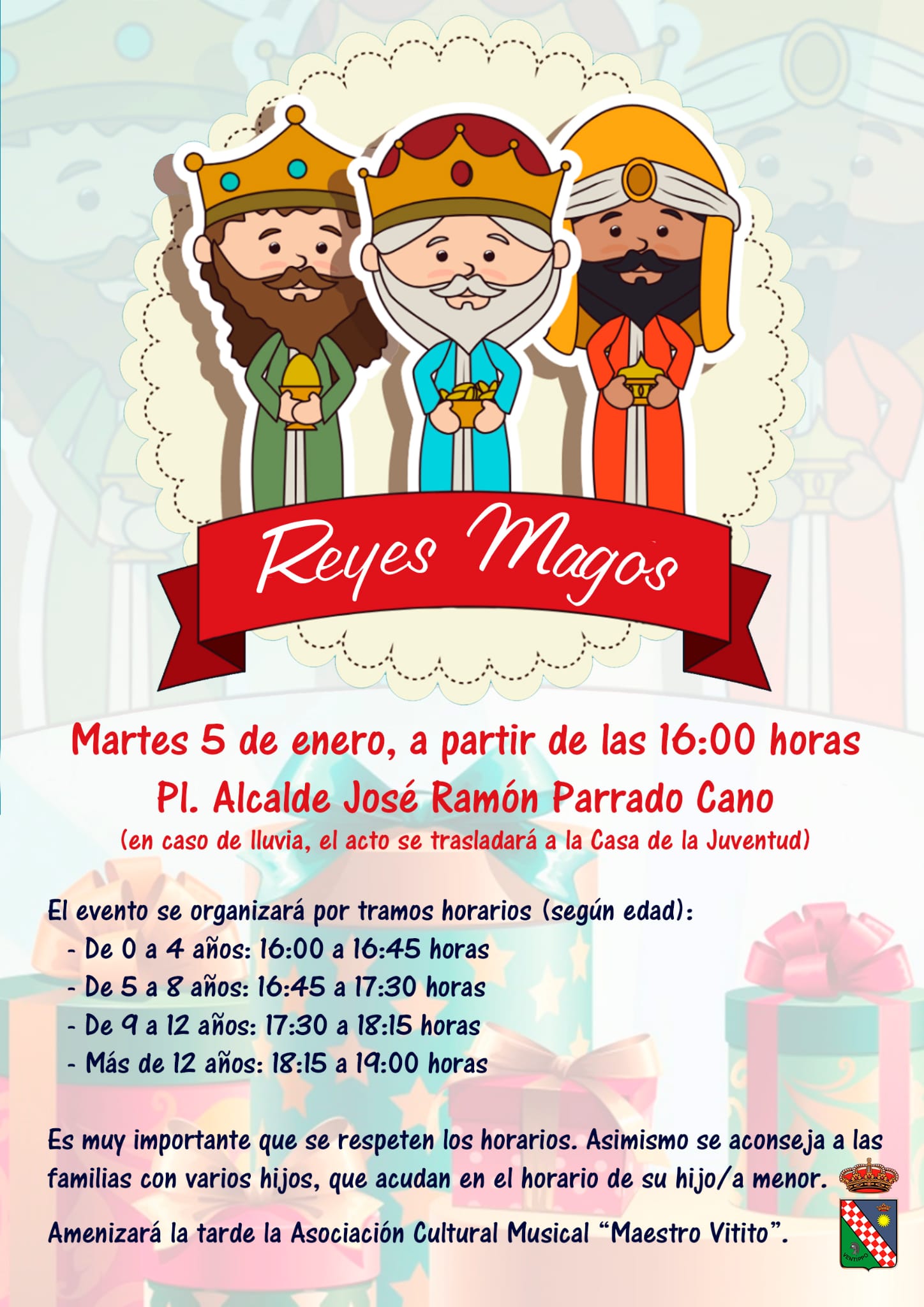 Hoy 5 de Enero es la visita de SS.MM. los Reyes Magos a nuestro pueblo. Os recordamos que estarán a partir de las 16:00 horas en la Plaza Alcalde José Ramón Parrado Cano, para que todos, y en especial, los peques de la casa, podamos disfrutar de su presencia.