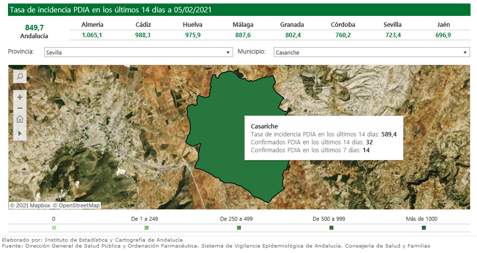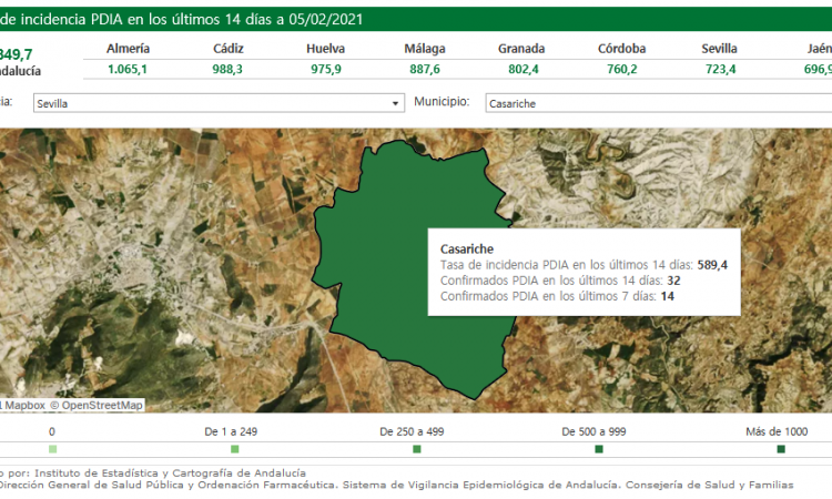 Los comités provinciales de la Junta de Andalucía evalúan y comunican cada lunes y jueves la actualización de los municipios que superan la tasa de 500 y 1.000 casos para la aplicación de las medidas restrictivas con una vigencia de 14 días que entran en vigor a las 0,00 horas de cada miércoles y sábado, respectivamente. Así, los valores epidemiológicos de Casariche provocan que las restricciones de movilidad que tiene implementadas nuestro municipio continúen vigentes, ya que la tasa de contagio continúa por encima de los 500 casos por cada 100.000 habitantes.