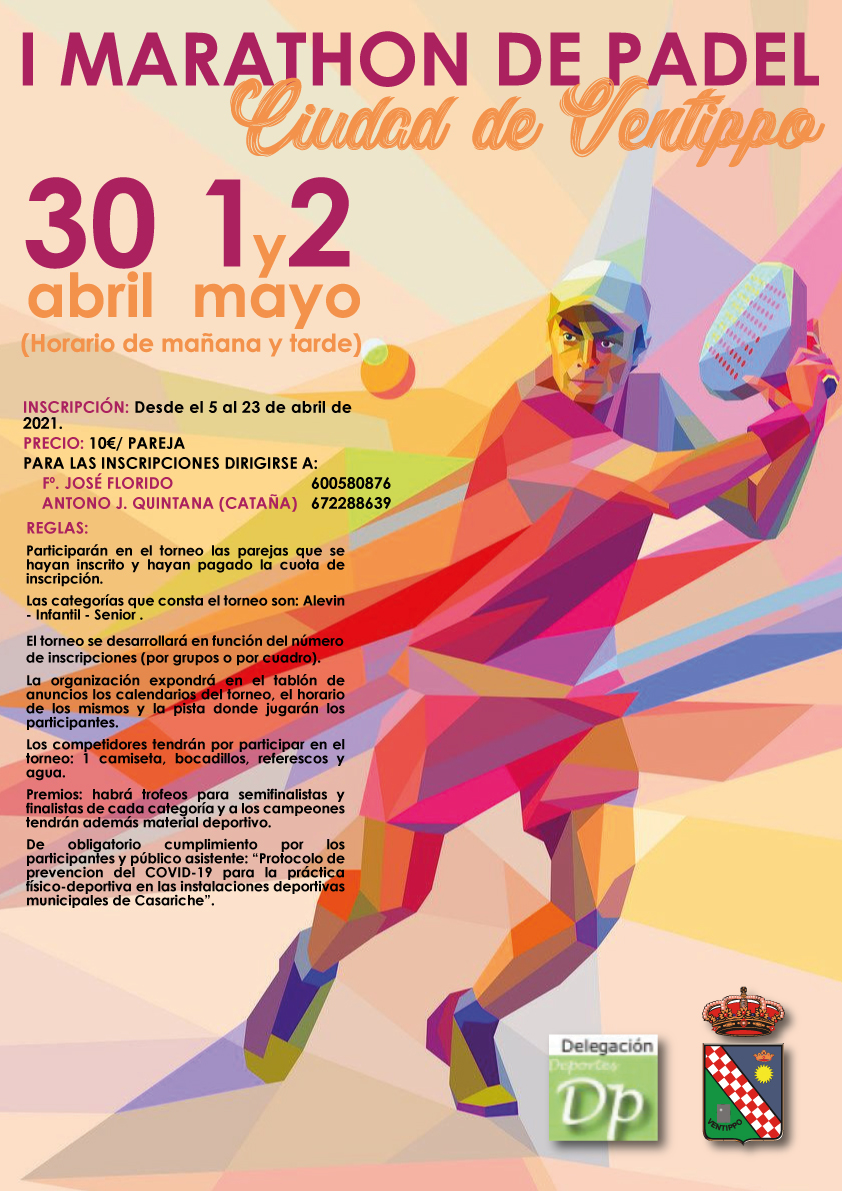 El «I Maratón de Pádel Ciudad de Ventippo», organizado por la Concejalía de Deportes de nuestro Ayuntamiento y cuya celebración hubo de aplazarse en Septiembre de 2020 a causa de la pandemia, se desarrollará los próximos 30 de Abril y 1 y 2 de Mayo en el Complejo Deportivo «Sergio Carnerero Gil» en horario de mañana y tarde.