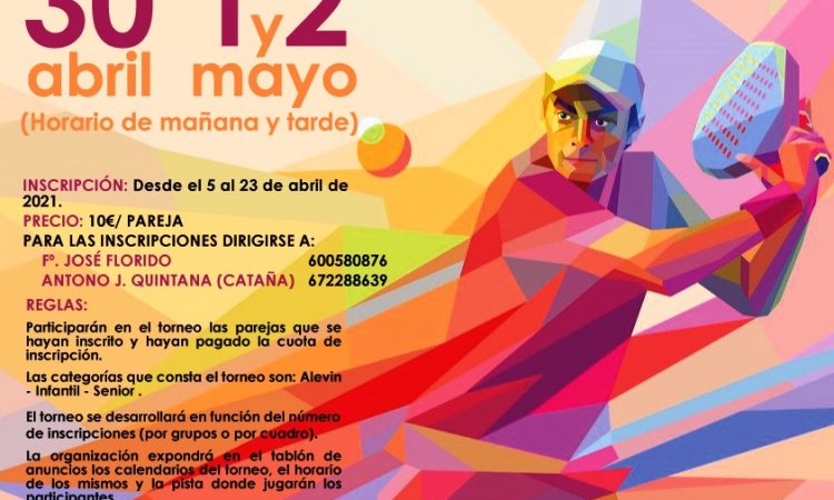 Este torneo se disputará en las categorías de alevín, infantil y senior y el plazo de inscripción estará abierto hasta este viernes 23 de Abril, teniendo un coste por pareja de solo 10’00€. Para realizar las inscripciones, deben dirigirse a Fco José Florido (600.580.876) o a Antonio J. Quintana (672.288.639).