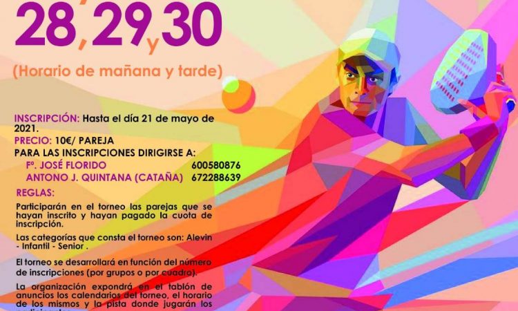 Este torneo se disputará en las categorías de alevín, infantil y senior y el plazo de inscripción estará abierto hasta el viernes 21 de Mayo, teniendo un coste por pareja de solo 10’00€. Para realizar las inscripciones, deben dirigirse a Fco José Florido (600.580.876) o a Antonio J. Quintana (672.288.639).