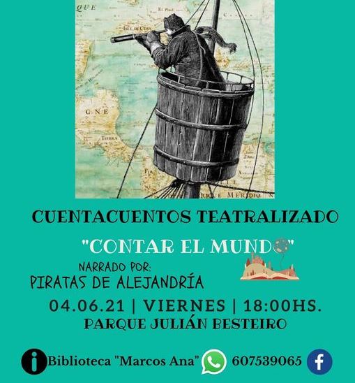 Esta actividad, apta para toda la familia y titulada «Contar el mundo», será narrada por Piratas de Alejandría y nos sumergirá a través de la palabra en lugares y mundos maravillosos. Se llevará a cabo al aire libre, a partir de las seis de la tarde del día 4 de Junio, en el Parque de Julián Besteiro.