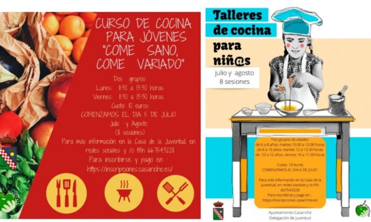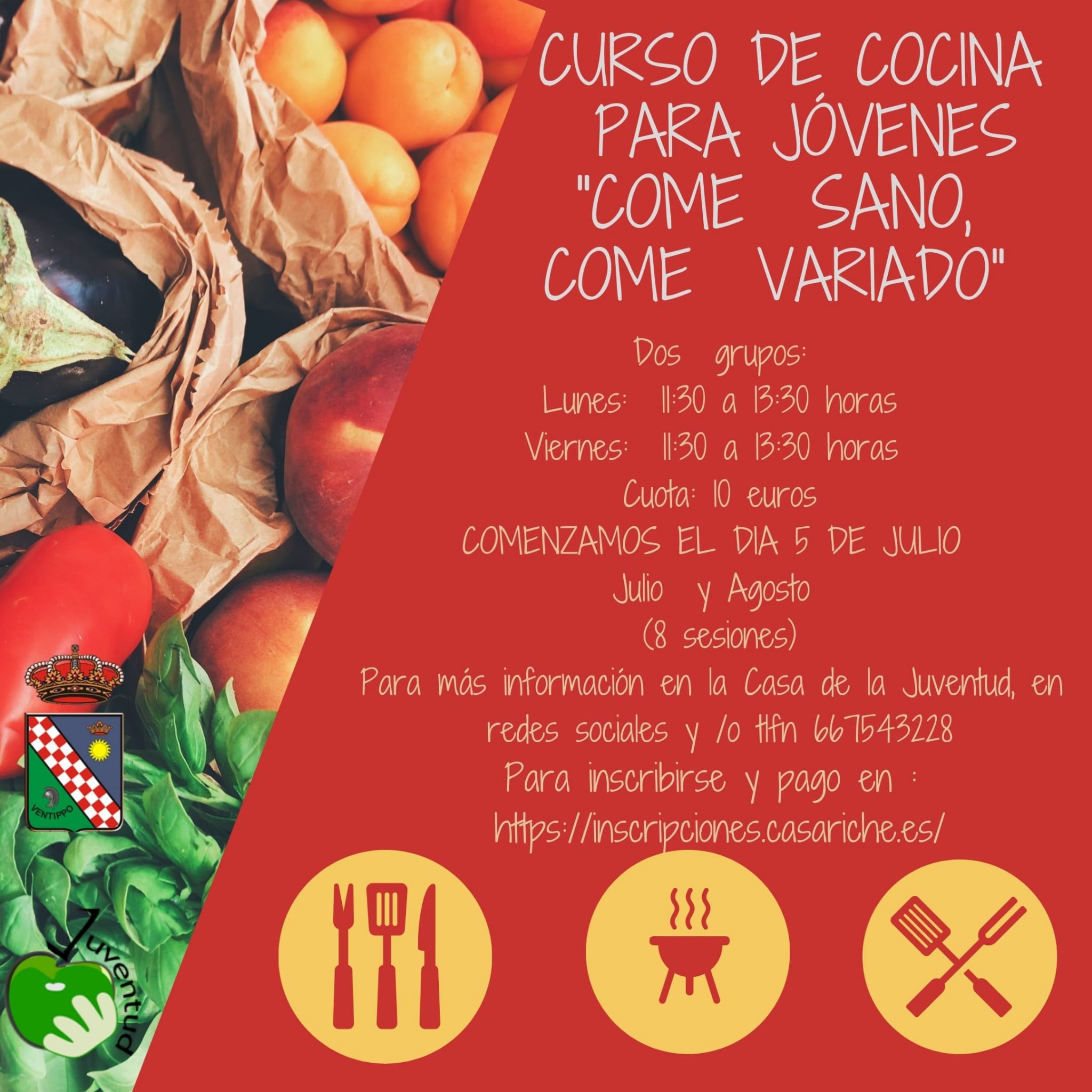 - Curso de Cocina para Jóvenes “Come sano, come variado”: Constará de 8 sesiones de 2 horas de duración cada una y se impartirán un día a la semana. Se establecerán dos grupos (lunes y viernes), en horario de 11:30 a 13:30 h. Comenzará el 5 de Julio.