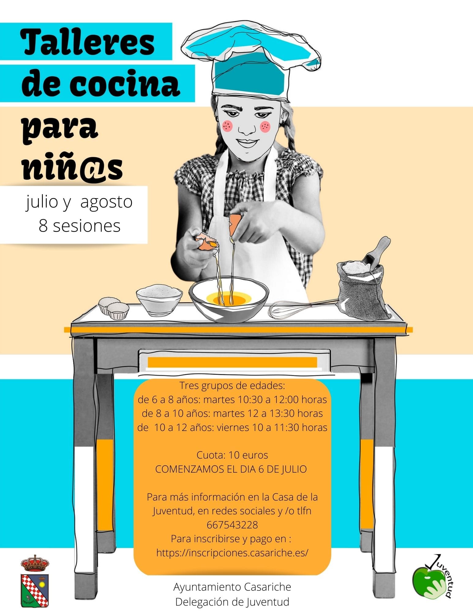 - Talleres de cocina para niñ@s: Constará de 8 sesiones de 1 hora y media de duración cada una) y se impartirán un día a la semana. Se establecerán tres grupos de edad, que asistirán los siguientes días y horarios, comenzando el 6 de Julio: