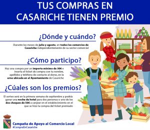 La primera de las iniciativas, se llama «Tus compras en Casariche tienen premio» la cual el año pasado se ejecutó por primera vez con excelentes resultados, y por ello, se activa nuevamente para los meses de verano. Este proyecto consiste en la incentivación del comercio local, ya que aquellas personas que realicen una compra por importe superior a 30€, en los meses de julio y agosto, en cualquier negocio de Casariche (independientemente de su sector comercial) podrán depositar su ticket de compra en una urna habilitada en el Ayuntamiento con su nombre, apellidos y número de teléfono al dorso, entrando así en tres sorteos que se llevarán a cabo en el mes de septiembre.