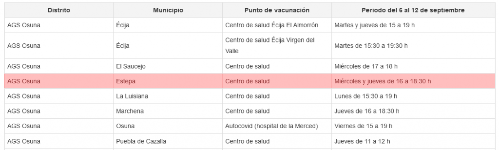 Desde el área sanitaria de Osuna se hace un llamamiento general a la población para una VACUNACIÓN SIN CITA. El Servicio Andaluz de Salud está realizando jornadas de vacunación sin cita contra COVID-19 para facilitar la administración de la primera dosis a los residentes en Andalucía que se encuentran fuera de su domicilio habitual así como a aquellas personas (de 12 a 65 años) contagiadas por COVID-19 hace más de cuatro semanas y que hayan superado la infección. También pueden acudir a los puntos de vacunación habilitados las mujeres embarazadas que no hayan comenzado la pauta de vacunación.