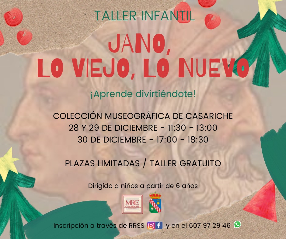 Ya tenemos aquí la segunda propuesta de talleres infantiles para esta Navidad en nuestra Colección Museográfica. Se trata del Taller «Jano, lo viejo, lo nuevo», que se impartirá a distintos grupos del 28 al 30 de Diciembre para que los peques de la casa disfruten de la Navidad con un toque cultural.