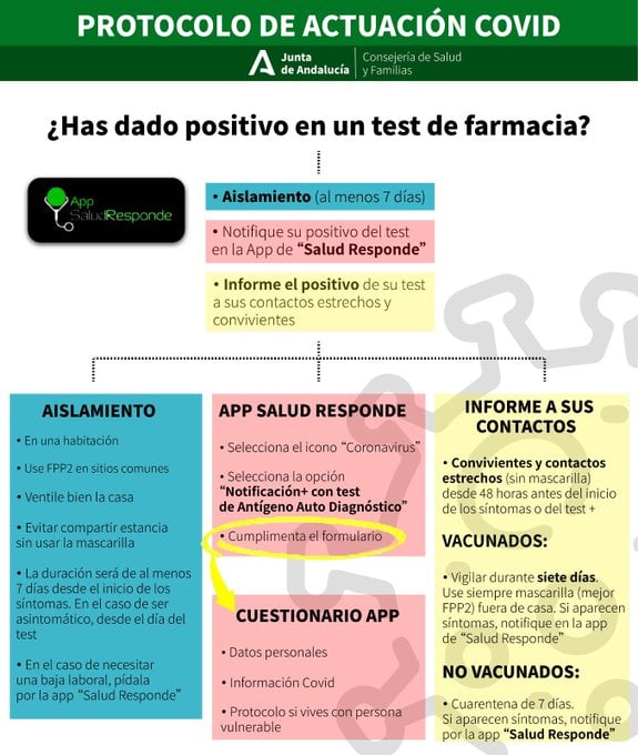 Os mostramos una infografía elaborada por la Consejería de Salud y Familias sobre los pasos a seguir si hemos dado positivo en un test de farmacia: