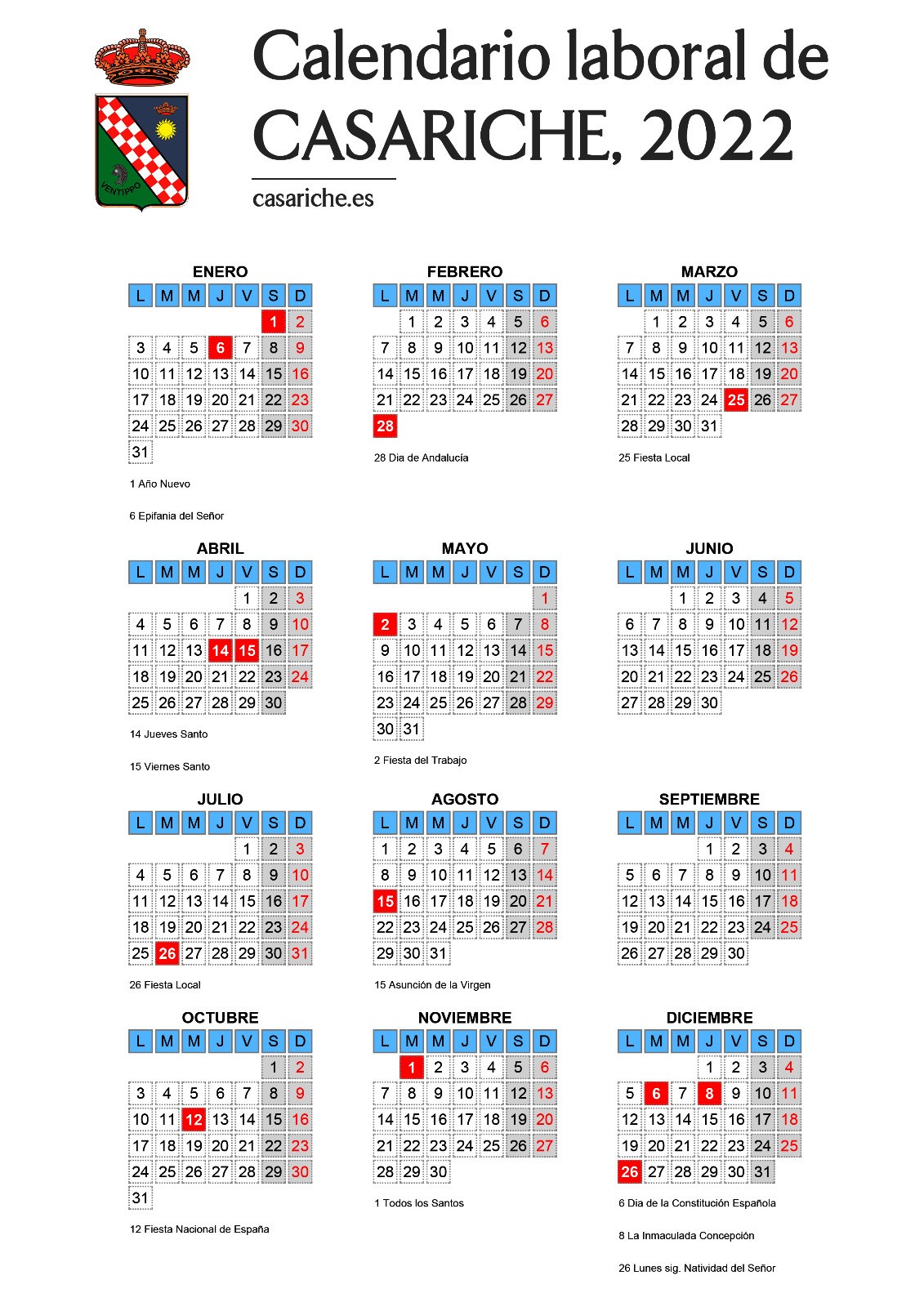 En estos primeros días de Enero, aprovechamos para facilitaros el calendario laboral de Casariche del 2022, de modo que podáis consultar, además de los festivos nacionales y autonómicos, las dos fiestas locales de este año, el 25 de Marzo, Día de Ntra. Patrona, la Virgen de la Encarnación, y el 26 de Julio, Día de Resaca de Feria.