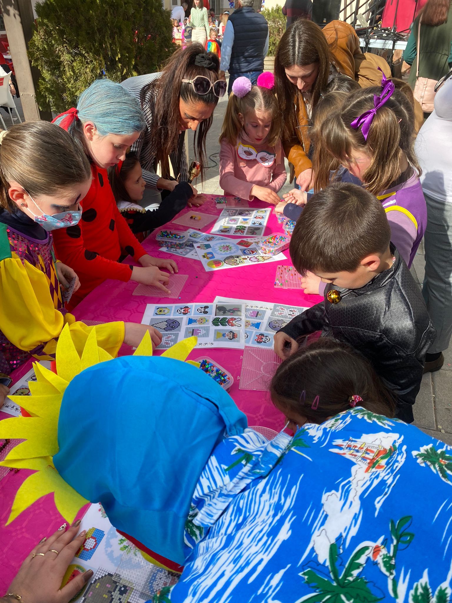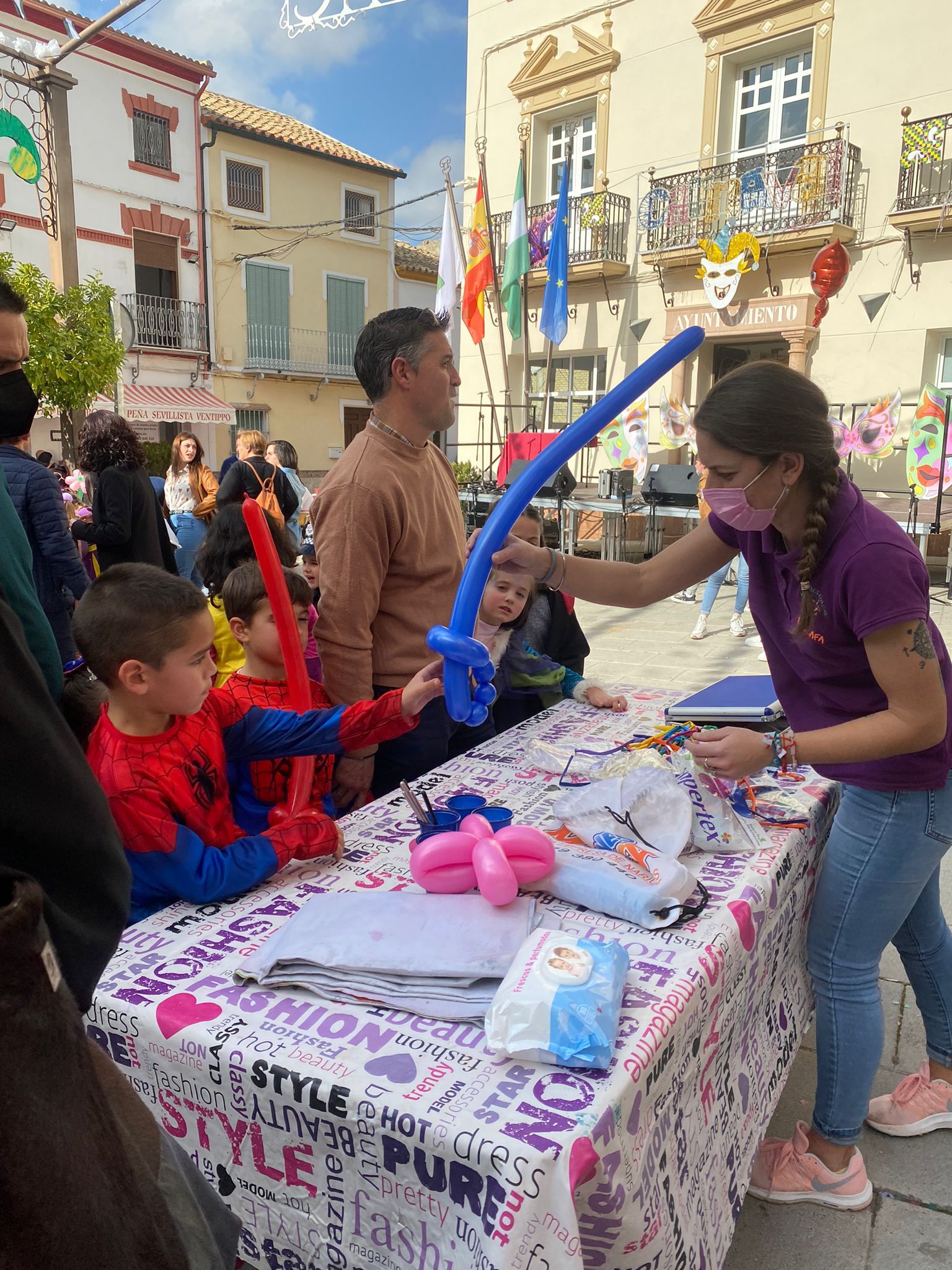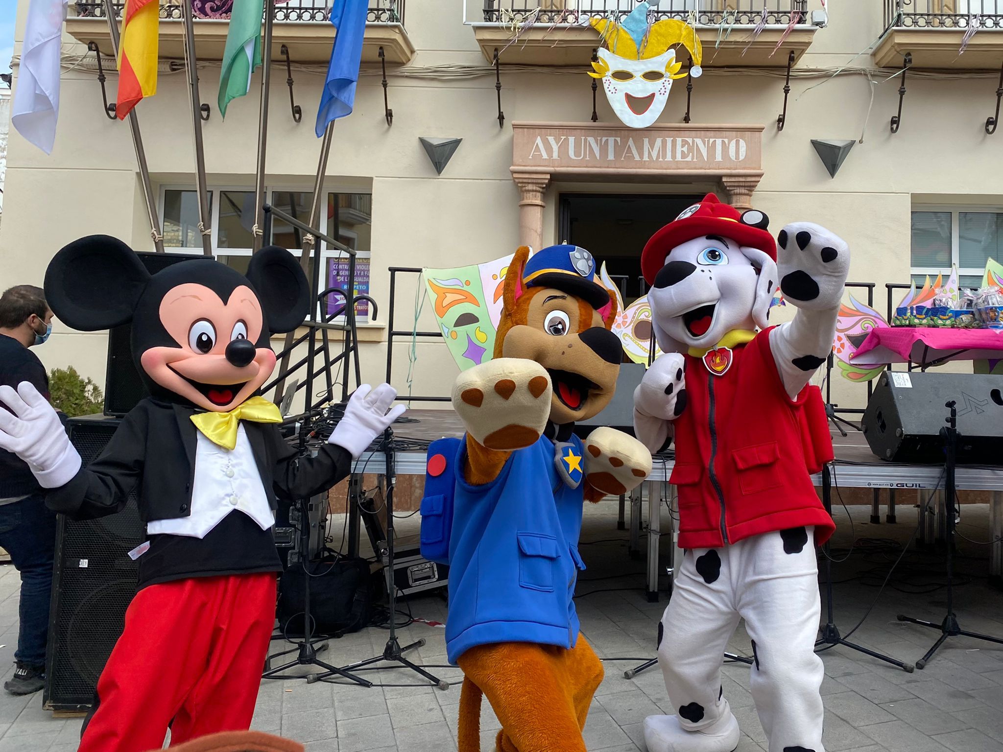 El ambiente carnavalero arrancó a las 12 del mediodía a cargo de la Charanga «Maestro Vitito», que estuvo acompañada de varios personajes Disney y de la Patrulla Canina, que encandilaron a los más pequeños, que también disfrutaron de lo lindo con los dos castillos hinchables, así como con los talleres infantiles (globoflexia, pintacaras, …) organizados para ellos.